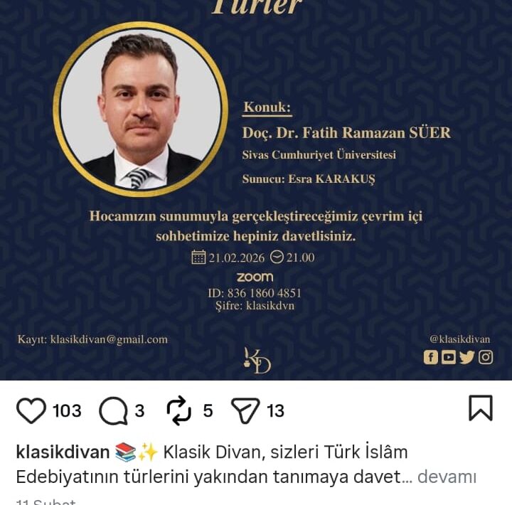 ADPU-nun Şamaxı filialının Dil, ədəbiyyat və onların tədrisi texnologiyası kafedrasının müəllimi Türkan Hüseynova 21 fevral 2026-cı il tarixində “Klassik divan” (“Klasik divan”) adlı YouTube kanalında canlı təşkil olunan “Türk-İslam ədəbiyyatında janrlar” (“Türk-İslam Edebiyatında Türler”) adlı seminarda iştirak etmişdir.