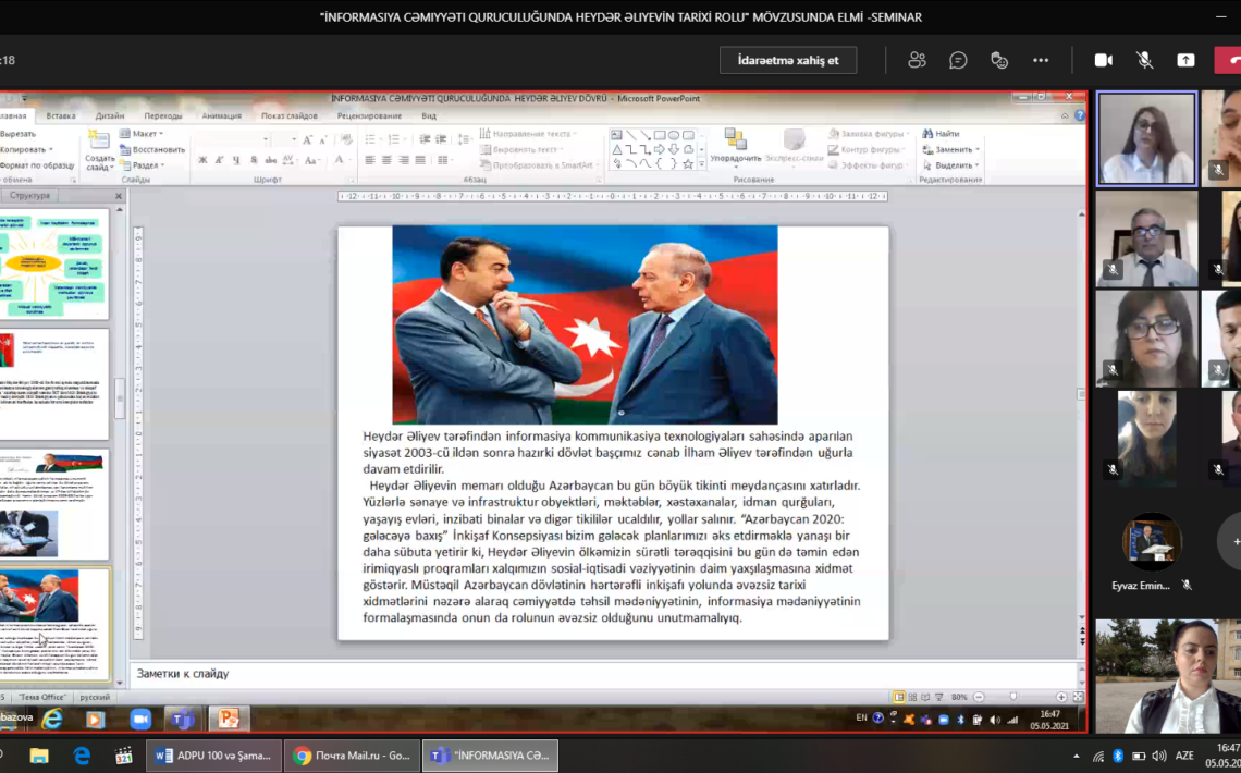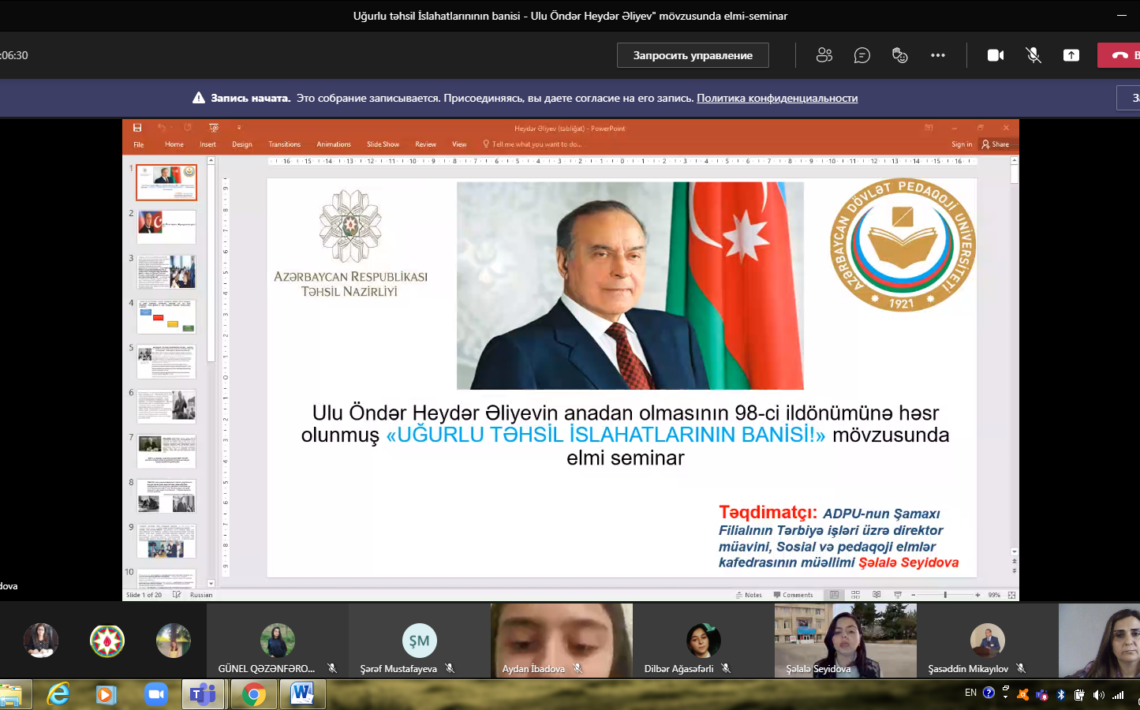 “Ulu öndər Heydər Əliyev irsi milli sərvətimizdir” mövzusunda onlayn konfrans. ADPU-nun Şamaxı filialında Ulu öndər Heydər Əliyevin anadan olmasının 98-ci ildönümünün qeyd olunması ilə əlaqədar təsdiq edilmiş Tədbirlər planına əsasən silsilə tədbirlər keçirilməkdə davam edir. Filialın professor-müəllim heyəti və tələbələri Şamaxı rayonunda da bu münasibətlə […]